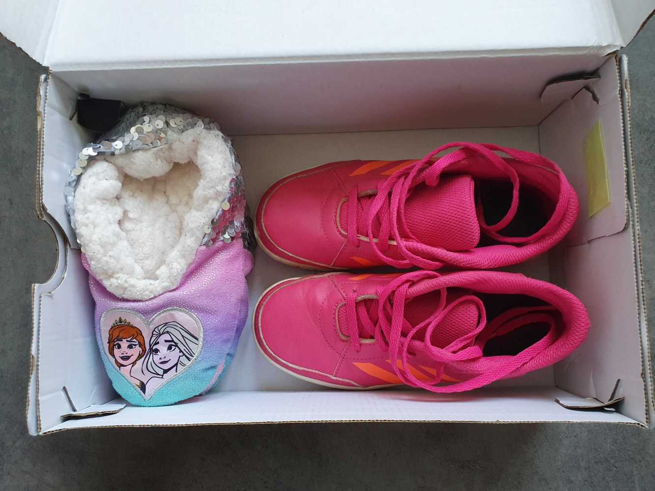 Szuper állapotban lévő kislány Adidas sportcipő 31-es méretben, valamint egy meleg Jégvarázsos mamusz. (mi ezt az utóbbit is 31-es méretre lőttük be)