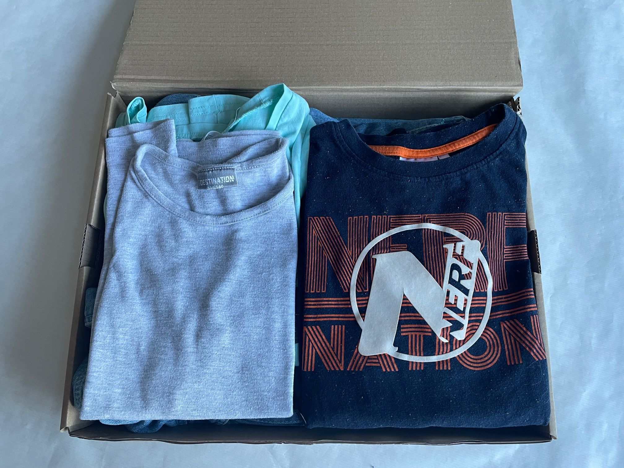 Szuper laza nyári 6 db-os ruhacsomag 6-8 éves kisfiúknak, 134-es méretben. A csomag tartalma: 1 fürdő naci, 1 farmer dzseki, 1 hosszú ujjú, 2 trikó, 1 rövid ujjú (Nerf)