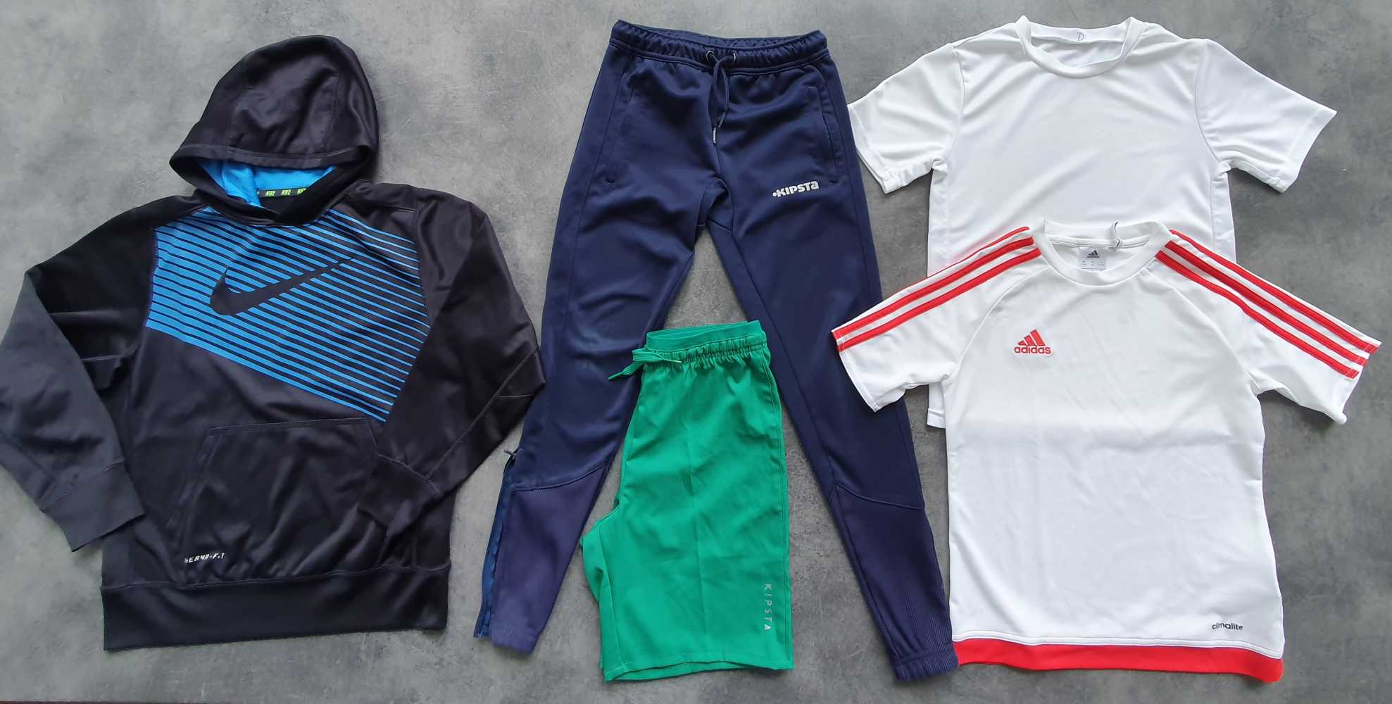 Ezeket a darabokat továbbnyűheti fiad a délutáni edzéseken! A csomagban találsz 1 Kipsta (Decathlon) melegítőnacit (térdén használati nyomokkal), aminek az oldala praktikusan felcipzározható, 1 Kipsta rövidnacit, 2 rövid ujjút (egyik Adidas) és 1 Nike kapucnis fölsőt. Méret: 140-146 (10-11 év)