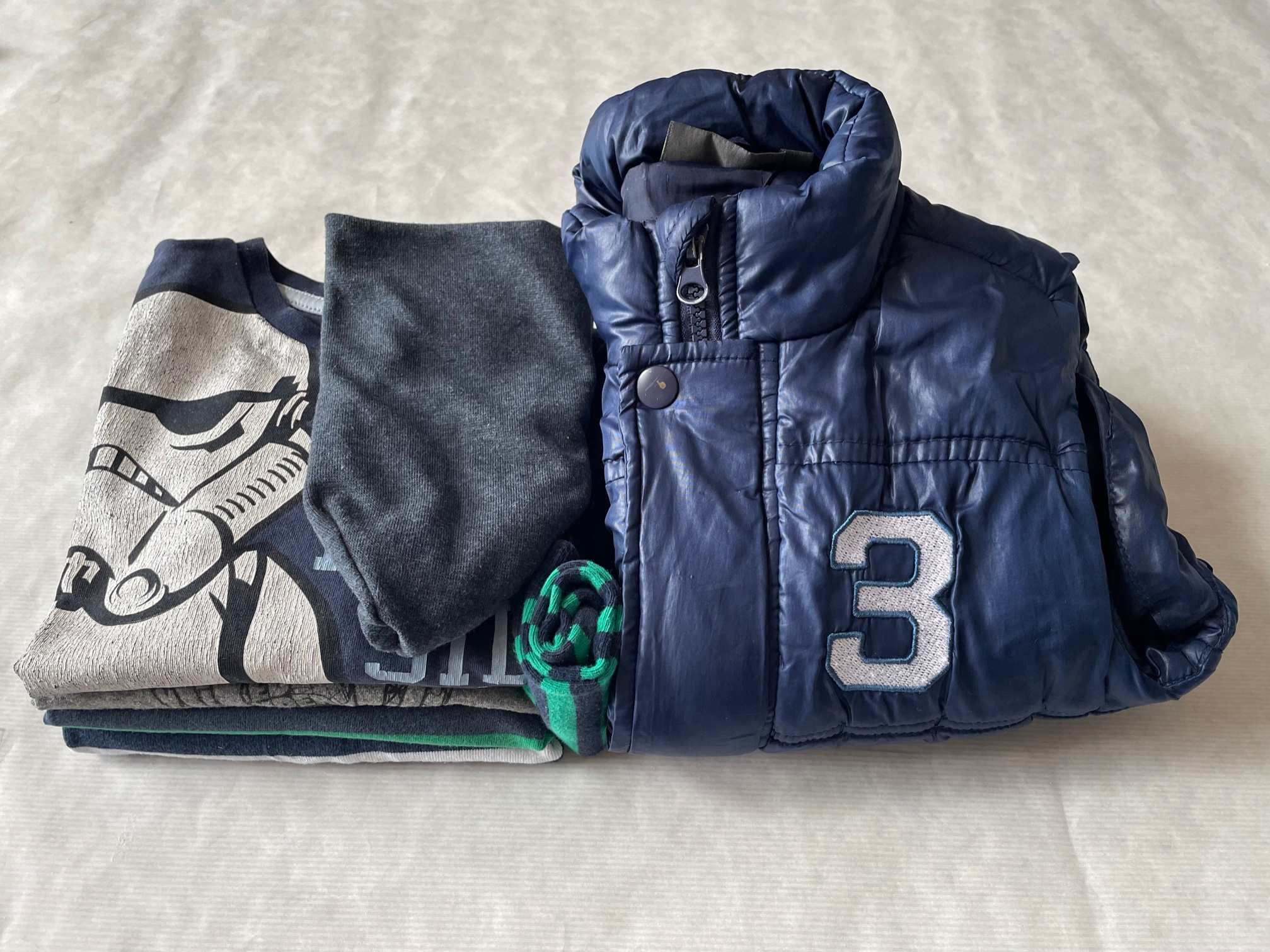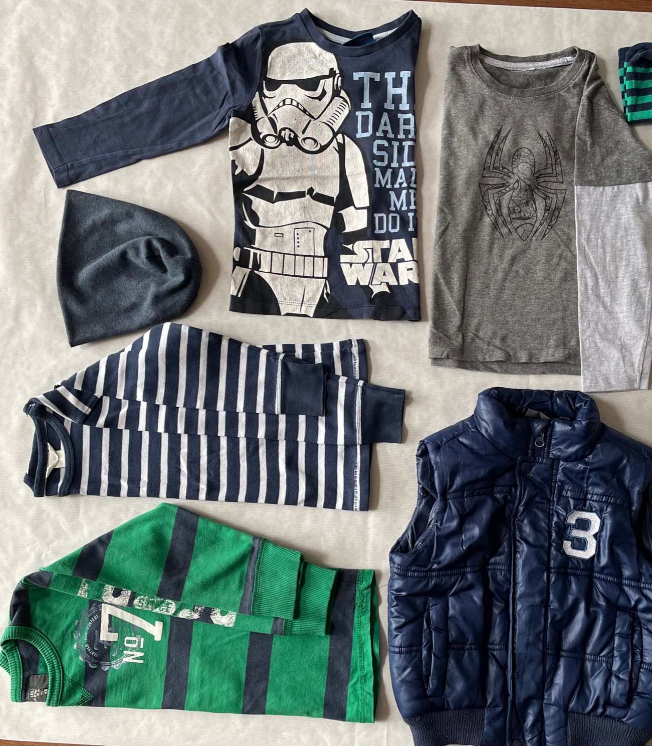 4-6 éves kisfiúra 110-116-os méretű, 7 db-os átmeneti ruhacsomag: 4 db hosszú ujjúval, 1 vékony sapkával, 1 pufi mellénnyel és 1 pár zoknival