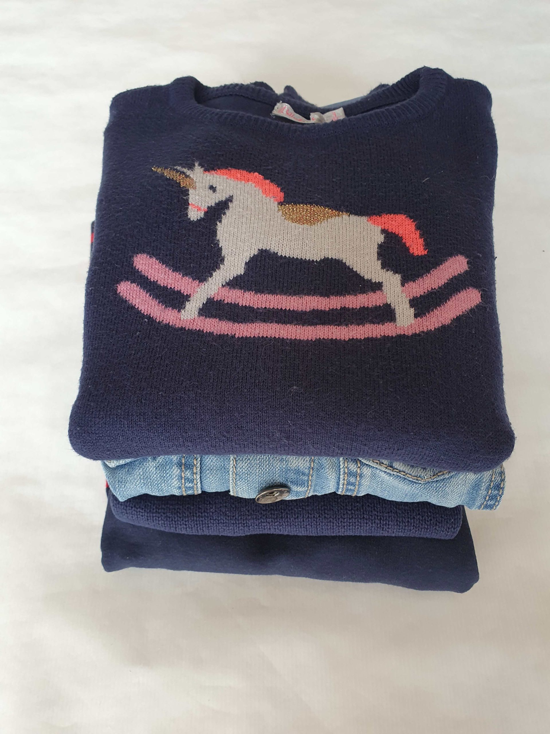 Szuper trendi kék átmeneti, téli ruhacsomag 2-4 éves lánykának.(98-110 méret) Benne 3 pulcsiruha, 1 farmer kabát